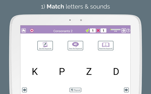 1) Match: Strengthen sound-letter matching by selecting the letters (graphemes) that match the sounds (phonemes) you hear. Work on letter names, consonants, vowels, or blends.