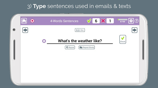 3) Type: Practice typing common sentences from 1-8 words in length. These 400 sentences are ones you might use in an online chat, text message, email, or social media discussion.