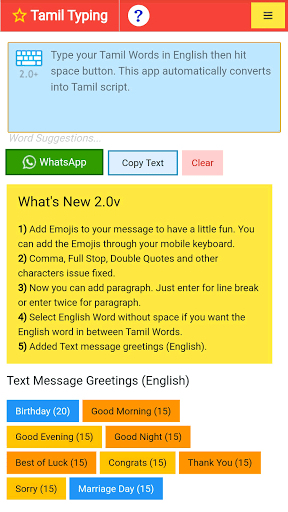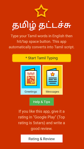 Tamil Typing (Type in Tamil) app is an English to Tamil transliteration tool. Type your Tamil words in English and hit/tap space button. This app automatically converts into Tamil script.