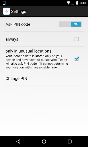 You can protect the app with a PIN code and set up the PIN to be requested only when the phone is in an unusual location. This further protects your data in case your phone is lost or stolen.