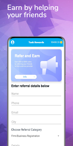 App user comes to know from a friend that he want to shift from one flat to another and is looking for reliable movers & packers. Now, app user can help his friend and earn money also in simple way. All app user has to do is, open the Task Rewards App, go to refer & earn screen, fill all the details about the friend and submit it. We will receive the details about app user's friend's requirement & we will share his requirement to packers and movers agencies. Now, when chosen packers and movers agency completes the shifting process and notifies us then we reward app user for referring his friend. This referral earning will be in range of 500 coins to 5000 coins, which when converted to real money, can be upto $5 (Rs.375 in Indian currency)