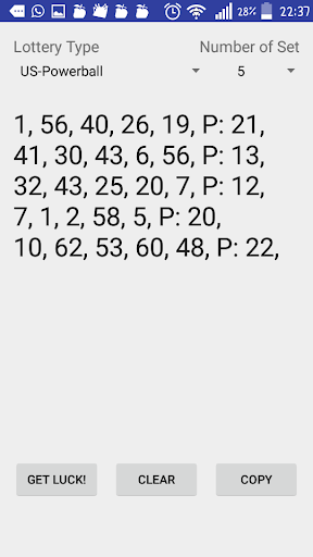 One click to random and generate Powerball/Mega Millions, EuroMillions, Mark Six, Big Lotto/Super Lotto tickets, clear board, copy to clipboard.