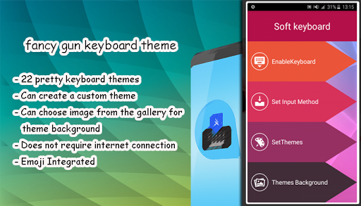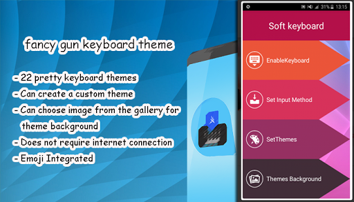 Fancy Gun Keyboard Theme provides flexibility to choose the keyboard theme from app’s built-in keyboard themes or you can create your custom by choosing your favorite image for background. You have to just enable the keyboard from the App. You can choose a picture from your gallery to set the background of the theme.