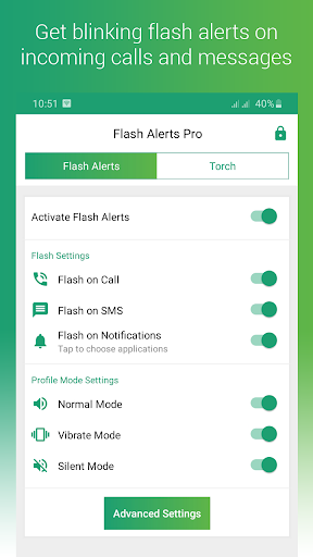 Flash Alerts Pro is an optimized and customized flashlight app that enables you to get blinking flash alerts on incoming calls, sms and notifications in an efficient way. Flash Alerts Pro also comes with a super bright LED flashlight Torch. This flashlight app is specifically helpful in meetings or noisy places, where the mobile is either silent or ringing can't be heard. Whenever there is an incoming call, message or other notification, the app starts blinking flashlight and the user gets alerted. Flash Alerts Pro is compatible with the latest as well as older android versions.