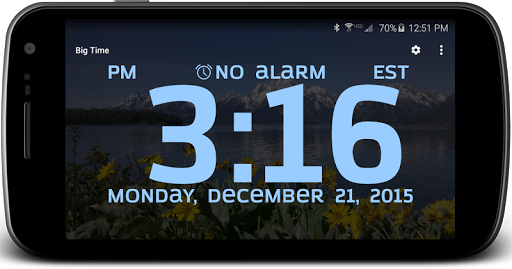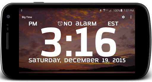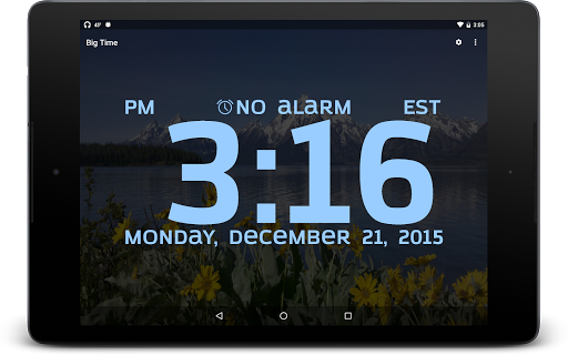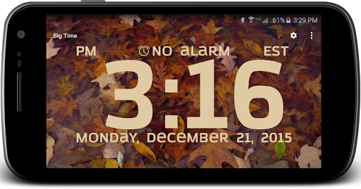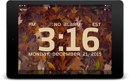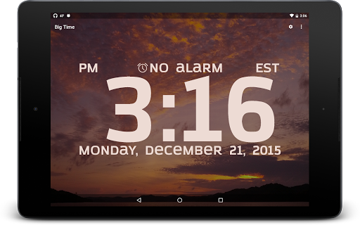 Big Time - elegant desk and night stand clock with time that fills the display. Also displays date, time zone and the next active alarm (if set). Touch the screen to dim for night use. Easily adjust night time dim level or set to automatic based on surrounding light (sensor if present). Use as a home screen widget or add on your lock screen. Can be run as a Daydream when docked. Use (included) photos as background or select a background color. Select one of four font types and colors.