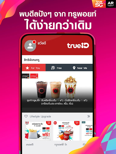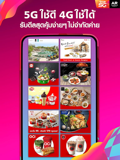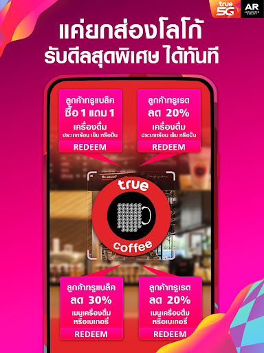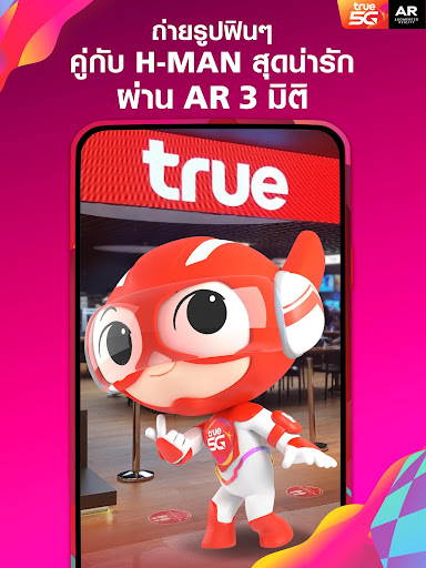 TRUE 5G AR cho phép khách hàng thực sự đạt được nhiều lợi ích từ TRUE sẽ dễ dàng hơn bao giờ hết thông qua công nghệ AR (thực tế Augmented), chỉ cần tạo logo cửa hàng thông qua ứng dụng để tìm các chương trình khuyến mãi đặc biệt và phiếu giảm giá sản phẩm miễn phí khác. Nhiều nội dung vô hình hơn Thông qua việc sử dụng AR