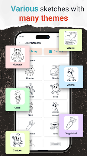 ️🎨 Many themes to sketch: animals, anime, chibi, flowers, for children, nature, cute, faces, food, vegetables, vehicles, and so on.