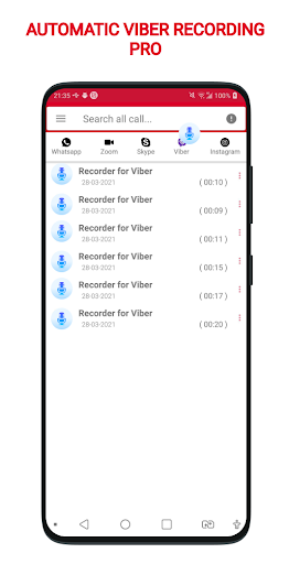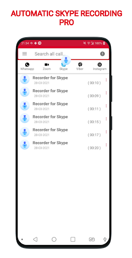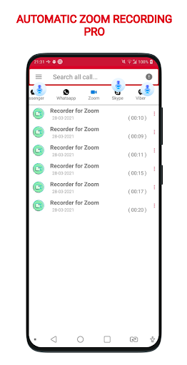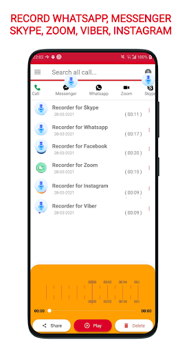 Phone call Recorder is able to detect Messenger,Whatsapp, Skype, Zoom, Instagram, Viber calls automatically and start recording.