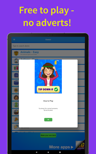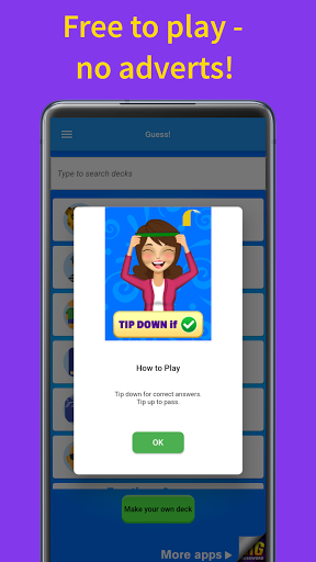 - Heads Up Mode - place phone on your forehead. Other players try and tell you what the word is. Tip down for correct answers, tip up to pass on the word.