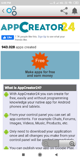 This is very simple app development site for all users. you can create for free, easily and without programming knowledge your native app for Android phones and tablets.Only need to download your application once and all changes you make from your control panel will be applied immediately.You can send messages(notifications) directly to your users, so you can deliver promotions and news to your users or customers in an immediate way.