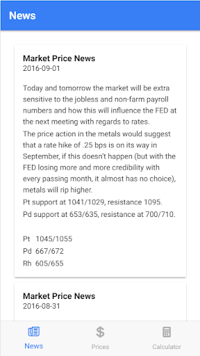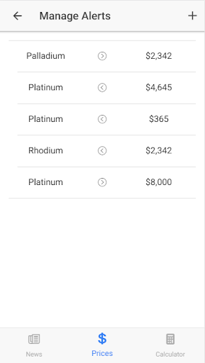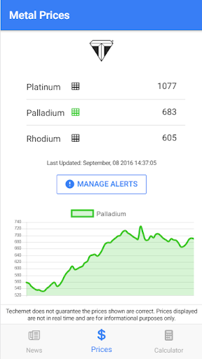 Our app shows the prices for Platinum, Palladium, Rhodium in real time for information purposes. You can also see historical prices for the past three months. We also know that you want to stay on top of the PGM prices so our app pushes alerts to you when the prices move.