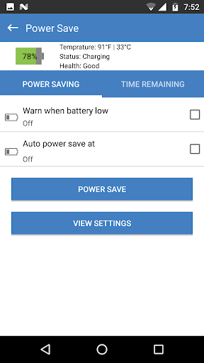 • Battery low alert and battery save modes are enabled.