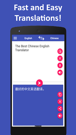 Chinese English Translator Free is useful for language learners, travellers, teachers, students, or anyone who doesn't know English or Chinese. It is also a useful app for chatting. You can translate any text , copy and paste it to the translator and copy paste the translated text back to the chatting app.