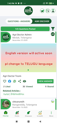 1. QUESTIONS & ANSWERS: Where a farmer posts a question on the doubt he/she may have, with images of the crop. AGRI DOCTOR answers all the questions of every farmer. All these Q&A will be available in this tab.