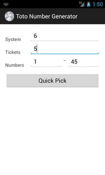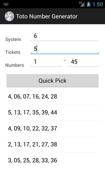 Toto Number Generator is the fastest most easiest and efficient method of grabbing your lucky set of numbers! *** Can generate unlimted random numbers in each ticket *** Can generate unlimted tickets *** No duplicate feature