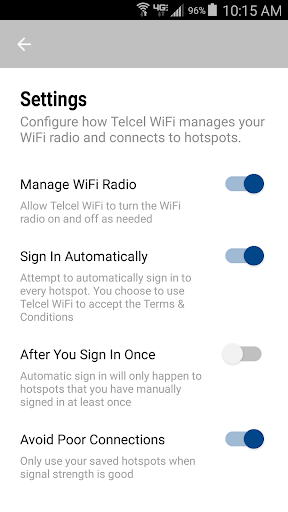 • Hotspots with Sign In: Most public hotspots have a "sign in" or "terms & conditions" page which you must agree to before accessing the Internet. You can use Telcel WiFi to automate many of them for you. For those that cannot be automated, you are notified so you can sign in yourself.