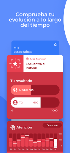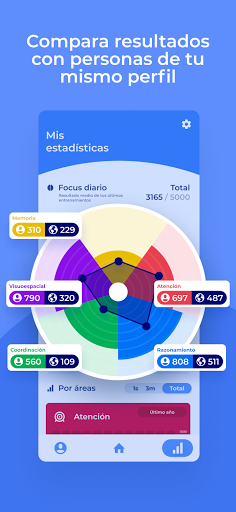 Focus - Train your brain has a statistics section where you can see your cognitive evolution during the last week, month or year. In addition, the app offers you a cognitive summary in which the average scores of the results of your daily workouts are shown.