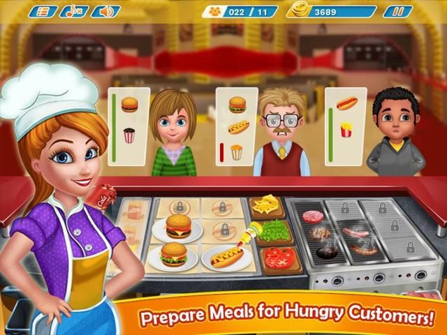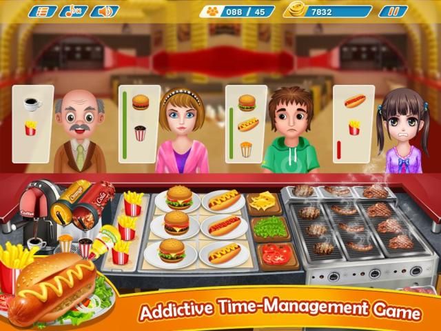Yummy challenge of making delicious burgers, fries, crispy chickens, juices, coffee, hamburgers, salads and much more. Customers are moving in for their lunch, mid-day deals and dinner as well. Do you have what it takes to be a master cooking chef? Play kitchen fever and show how fast you can serve food to customers in your burger shop. Make tasty food and satisfy your customer’s appetite. Run your own burger shop and serve tasty burgers to your customers. Upgrade your kitchen and produce even more delicious foods. Time to raise the level of your cooking speed and accuracy because each level gets tough with time. Deal with the customers and deliver their orders on time. Several gameplay levels include amazing cooking and serving. Yummy challenge of making delicious burgers, fries, crispy chickens, juices, coffee, hamburgers, salads and much more
