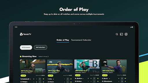 Tennis TV is the official live and on demand online video streaming app of the ATP Tour. Stream live tennis on your favourite device from every ATP Tour tournament, as well as full match replays, classic matches, highlights and live scores as they update in real-time. Watch more than 2,500 ATP singles and doubles matches each year from every ATP Masters 1000, ATP 500 and ATP 250 tournament, plus the Nitto ATP Finals and Intesa Sanpaolo Next Gen ATP Finals.