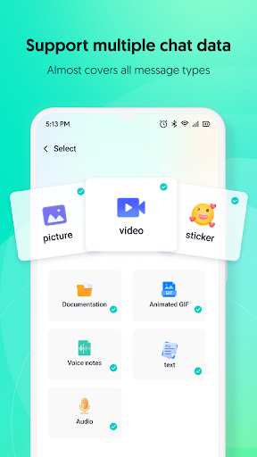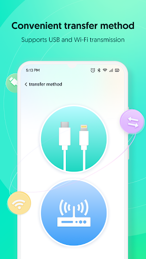 * Transfer via OTG or Wi-Fi. Data such as text messages, audio messages, photos, videos, emojis, stickers, and other data can be immediately transferred to an iPhone via an OTG data cable or to an Android via Wi-Fi.