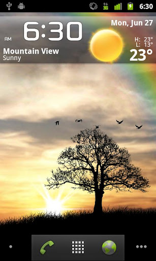 Imagine looking at the sky at dawn over the hill. This live wallpaper features tree silhouette, on top of a morning sky background with soft cloud moving, birds flying, and rainbow appearing occasionally. In the morning, a flock of birds will come out and cheer your morning with a greeting. The scene has full parallax effect.