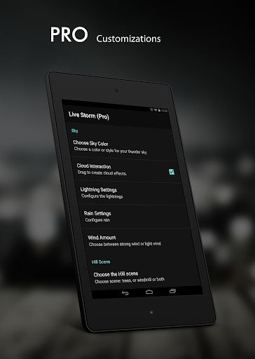 This live wallpaper features a spectacular thunderstorm sky with moving clouds, rain, and occasional lightning. With this Pro version, you can customize your scene fully, from choosing the sky color to the trees and windmills on the hill. When you swipe to change home screens, the scene moves with parallax effect to simulate 3D space. This is our latest addition to the Skies series, so if you have feedback or ideas, do send us an email!