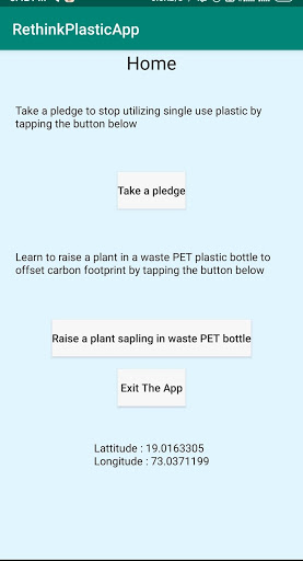 UNEP (United Nations Environment Programme) and it's outreach partner TERI (The Energy and Resources Institute) under the project Promotion of Countermeasures against marine plastic litter in Southeast Asia and India, proudly present the Rethink Plastic App. With this app, the user can Take A Pledge to stop utilising single use plastic. Learn about how user can participate to offset carbon footprints by planting native tree saplings in waste PET bottles step by step. The user can also navigate to the official website of the Rethink Plastic Project.