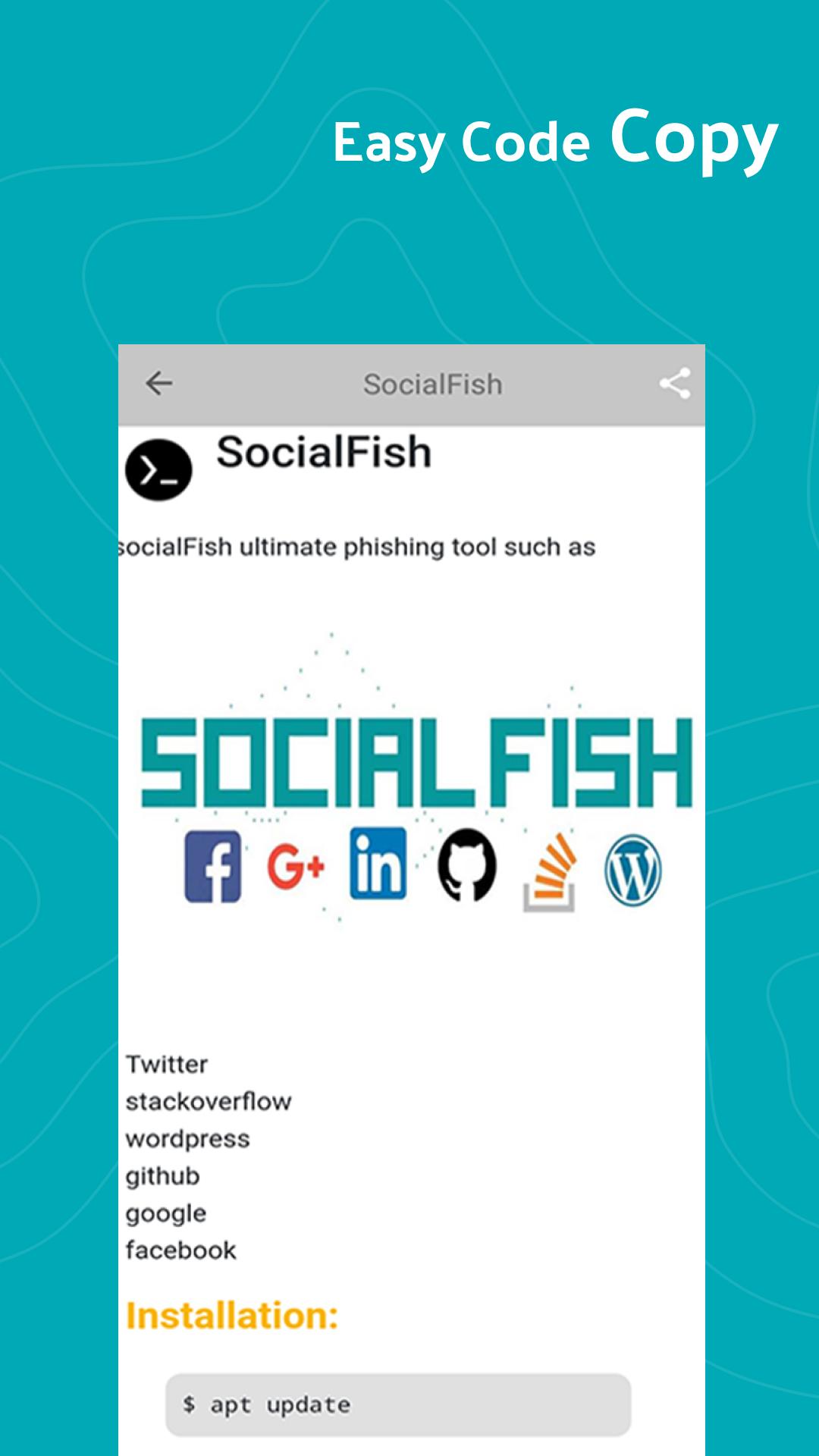 An application that has plenty of open-source tools guides. It's easy to copy and use them on your terminal. You can use these tools for penetration tester, ethical hacking, Security and for education Purpose also.