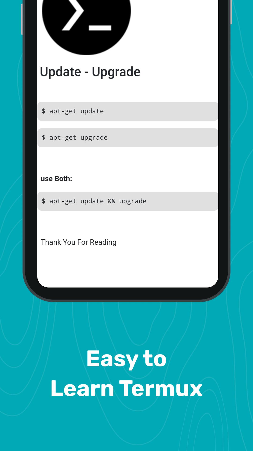 • This app you will easily learn how to use termux and all its tools and commands.