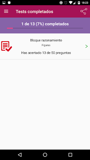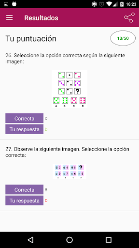 Al finalizar cada test Psicotécnico con nuestros tests de entrenamiento mental, podrás ver un resumen de todas las preguntas, tu respuesta y la respuesta correcta. De igual forma, la app te irá marcando los tests que ya hayas realizado, los cuales podrás realizarlos tantas veces como sea necesario para conseguir la mejor calificación posible. Tendrás a tu disposición una barra de progreso para ver, en todo momento, la cantidad de ejercicios que te faltan por realizar y llegar lo mejor preparado posible a tus exámenes en la categoría de psicotécnico.