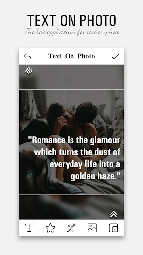 Quickly add text to photo with Text on photo, easily insert your favorite quotes. Create beautiful love quotes with text and creative typography sticker. Create love quotes, romantic love quotes and send to your beloved every day, let's try text on photo now.