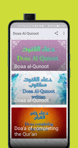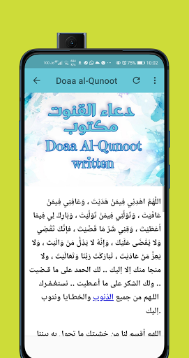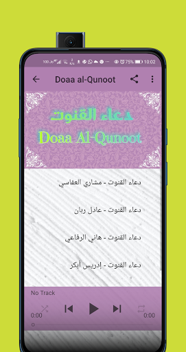 An application contains several sections, including listening to the Qunoot prayer from more than 10 sheikhs
