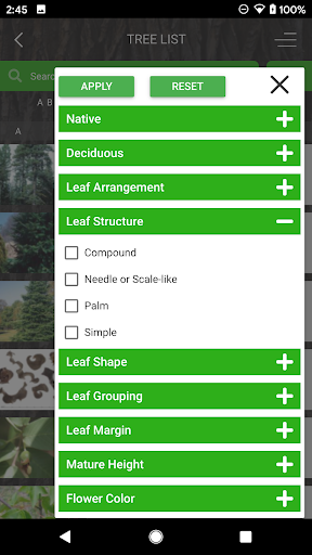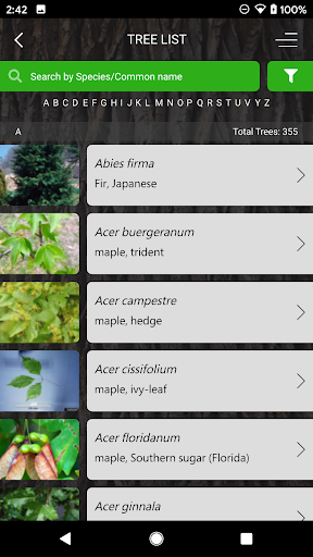 There are two ways to search for species. One, a simple key by characteristics directed approach, allows users to select one or more tree characteristics from large color icons. At any point in the process the possible species may be displayed. The other way is to select certain filters from the A-Z species list. The filter tool can also narrow down possible choices at any stage in the keying process. The species list is searchable by common or scientific name, or simply alphabetically.