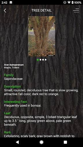 My Tree ID, developed by Texas A&M Forest Service, facilitates tree species identification based on leaves, flowers, seed, bark or location using a key, descriptions, and tree images. It contains over 1500 images from 475 different tree species and includes known occurrence maps from the Biota of North America Program for nearly all species. Individual tree detail pages have complete descriptions including interesting facts and similar species. The map feature allows users to input an address, select current location, or click on any point on the map to narrow the list. A full glossary and a tree age estimator tool complement the key and species list.