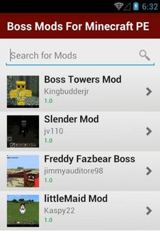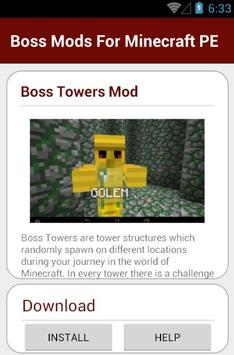 Boss Mods For Minecraft PE Boss Towers are tower structures which randomly spawn on different locations during your journey in the world of Minecraft. In every tower there is a challenge in the shape of a monster which you have to defeat to get the good loot it had on it.
