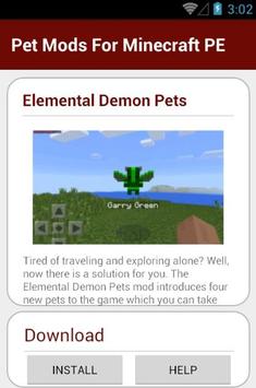 Pet Mods For Minecraft PE Tired of traveling and exploring alone? Well, now there is a solution for you. The Elemental Demon Pets mod introduces four new pets to the game which you can take with you on your adventures in Minecraft. Each of the new pets got a unique ability. For example, one of them can attack your enemies with explosions and another pet can help you switch between day and night.