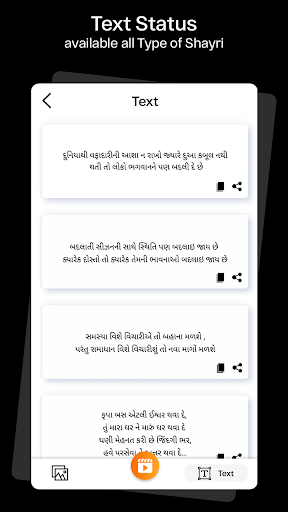 Gujarati Status 2021 is one of the best Gujarati status and Gujarati shayari application. This application have largest collection of Gujarati Shayari, Gujarati Suvichar and Gujarati Status. Gujarati Status 2021 contains more than 6 categories and 5000 Best Gujarati status. You can get best Gujarati status for share on whatsapp, facebook etc social media. Download and enjoy daily new Gujarati Status with us.