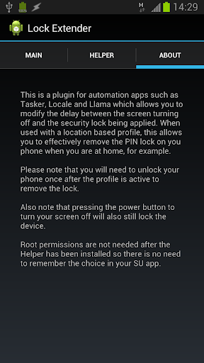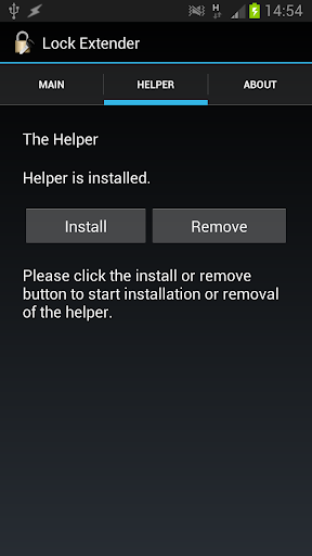 ** I have been getting some inconsistencies when installing/removing the Helper. If you are having any problems, update Lock Extender to latest version, open it up, remove the helper and also delete any LockExtenderHelper.apk files from // and /system/app (you will need a root-explorer to delete from /system/app, then reboot. Do an install of the Helper from within Lock Extender and one last reboot. ** You can also use a tool such as Titanium Backup to remove LockExtenderHelper.