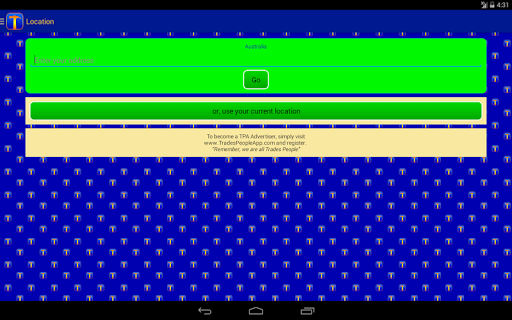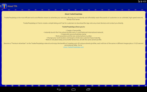 Trades People App is designed to give high speed, real time, 24/7 access to premium trade service providers locally, nationally or internationally.