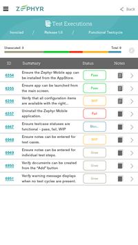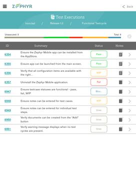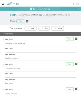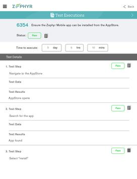 Zephyr Mobile is a fast mobile application that allows you to connect to Zephyr Enterprise or Community Edition and execute testcases rapidly. With this application, log into your Zephyr real-time test management server – either On Premise or SaaS – and access all test executions assigned to you. Quickly execute each testcase with a couple of taps while metrics and dashboards get updated in real-time. Blast through all of your assigned testcases from wherever you are.