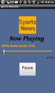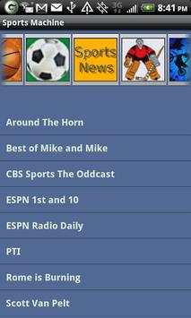 The Sports Machine plays sports podcasts from the best sources on the Internet such as ESPN and CBS Sports. It covers sports talk shows, Football, Baseball, Basketball, Soccer, Golf, Hockey, Action Sports, Auto Racing, and the Olympics. Many of the most popular sports podcasts from iTunes are included.