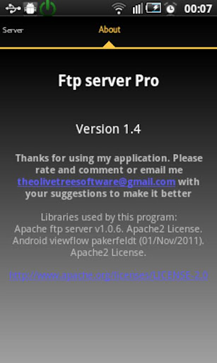 Libraries used by this program: Apache ftp server v1.0.6. Apache2 License. Android viewflow pakerfeldt (01/Nov/2011). Apache2 License: http://www.apache.org/licenses/LICENSE-2.0.html