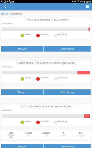 - Pasiruošite vairavimo teorijos egzaminui daug greičiau: sistema seka jūsų mokymosi procesą ir jei konkretų klausimą teisingai atsakėte bent du kartus iš eilės – jums šio „išmokto“ klausimo nebepateiks;