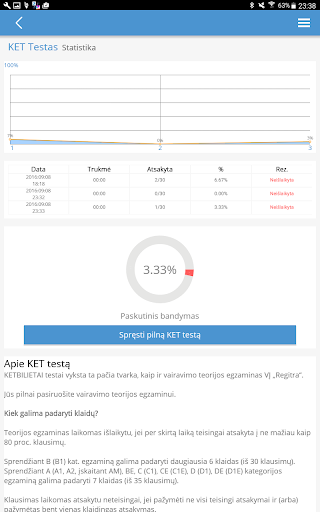 Aplikacijoje yra NEMOKAMA testinė versija ir taip pat MOKAMA pilna versija, kurioje yra daugiau nei 1800 klausimų, panašių į "Regitros" egzamino klausimus ir atnaujintų pagal naujas KET. Tūkstančiai vairuotojų jau sėkmingai išlaikė egzaminą, išlaikyk ir tu.