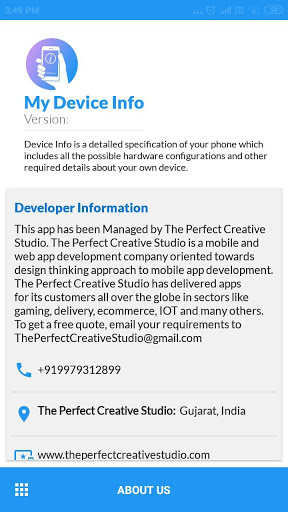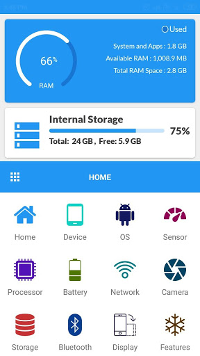 Device Info is a simple and powerful Android application which gives you complete information about your mobile device with advanced user interfaces. Device Info includes information about CPU, RAM, OS, Sensors, Storage, Battery, SIM, Bluetooth, Installed Apps, System Apps, Display, Camera, etc.