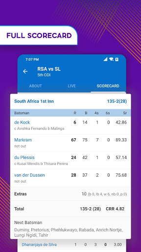 TAB Cricket also provide perfect cricket scorecard with fastest updating ball by ball cricket commentary. User also get details about playing 11 squad from about page of match. User will get notifications regarding match updates like Lineup, Toss, Wicket, Fifty, Hundred etc.