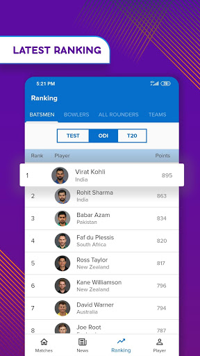 Cricket formats like T20, ODI and Test ranking also available for Batsman, Bowler, All-rounder and Team.