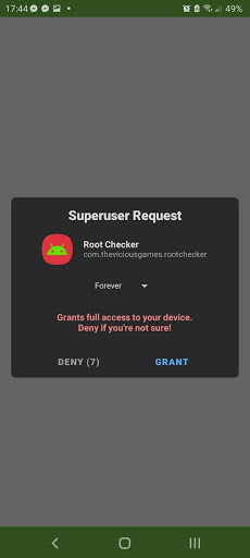 If the Superuser management applications (SuperSU, Superuser, etc.) are installed and working properly, these applications will prompt the user to accept or deny the root access request from Root Checker. Accepting the request will allow Root Checker to check for and confirm root access. Denying the request will result in Root Checker reporting no root access.