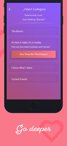 - You can choose which relationship level you’re currently at so that you can dig deeper with your person at your own pace.