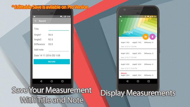 Relative Measurement: Hold your device to slope or angle then touch angle meter and measure rotation relative to previous position. This mode is perfect for using as GONIOMETER.
